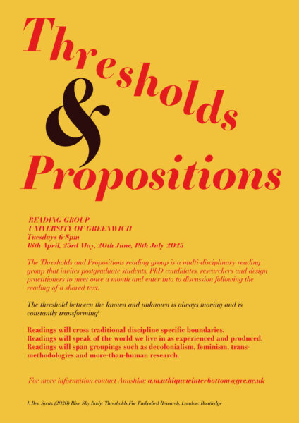 Thresholds and Propositions is a multi-disciplinary reading group that invites postgraduate students, PhD candidates and external practitioners to meet once a month and enter into discussion following the reading of a shared text. This mixed grouping is key to push the boundaries between theory, literature, discussion and the worlds we design. By being open to practitioners of all levels we hope to break down some of the boundaries between and within academia and practice.